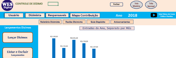 Veja em forma de Gráfico entradas Mensal de um determinado ano, e valores de tipo de entradas como Dízimos Ofertas… Com apenas um clique.